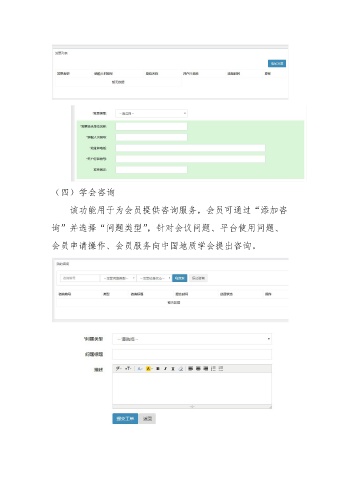 (四)学会咨询 该功能用于为会员提供咨询服务,会员可通过“添加咨 询”并选择“问题类型”,针对会议问题、平台使用问题、 会员申请操作、会员服务向中国地质学会提出咨询。