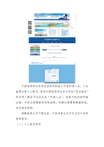 中国地质学会欢迎全国地质科技工作者申请入会,入会 前需注册个人账号,登录中国地质学会官方网站“学会服务” 栏目进入服务平台后点击“申请入会”,选择手机或者邮箱 注册,手机注册需要获取验证码,邮箱注册需要邮箱验证, 设定登录密码。 原数据库会员不需注册,可使用原会员号作为用户名和 密码登录。 (二)个人账号登录