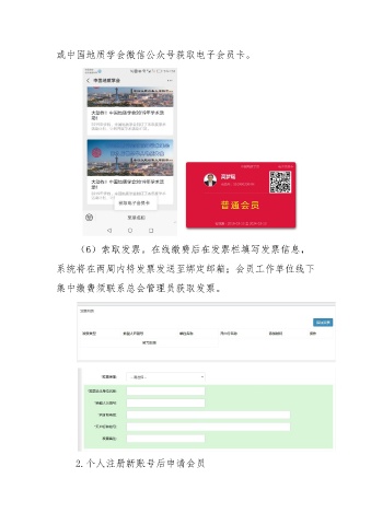 或中国地质学会微信公众号获取电子会员卡。 (6)索取发票。在线缴费后在发票栏填写发票信息, 系统将在两周内将发票发送至绑定邮箱;会员工作单位线下 集中缴费须联系总会管理员获取发票。 2.个人注册新账号后申请会员